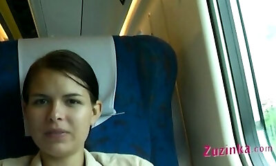 Shameless super-bitch Zuzinka flashes her shaved pussy in the train