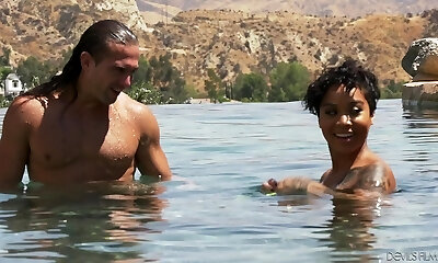 Bare ebony babe Lala Ivey is swimming in the pool before a kinky romp with her white neighbor
